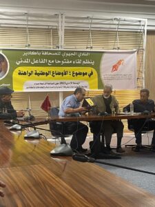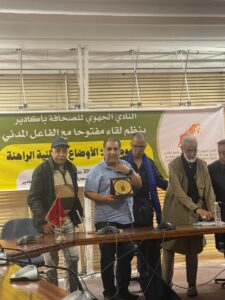 نظم النادي الجهوي للصحافة بأكادير لقاء مفتوحا مع الفاعل المدني مصطفى المتوكل الساحلي ،في موضوع : ” الأوضاع الوطنية الراهنة “،وكان ذلك يوم الجمعة 9 ماي الجاري بغرفة التجارة و الصناعة و الخدمات ،بحضور فعاليات ثقافية ،سياسية ،جمعوية وإعلامية .