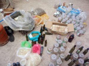 وقد تفاجأ فريق المداهمة بالمواد الغريبة وغير المألوفة التي يضمها سطح المنزل، حيث عُثر على قنينات زجاجية وبلاستيكية، وأفران تسخين، وكميات من الأعشاب والمكونات الطبية القوية التي تُشكل خطراً على الصحة، بالإضافة إلى ملصقات إشهارية جاهزة للاستعمال في عملية الترويج الإلكتروني.