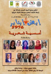 في أجواء ثقافية وفنية نابضة بالرمزية والدلالات، تحتفي جمعية الجيل الجديد، بشراكة مع رابطة كاتبات المغرب ورابطة كاتبات إفريقيا، بالسنة الأمازيغية إيض يناير 2976، وذلك في نسختها الثالثة، تحت شعار: